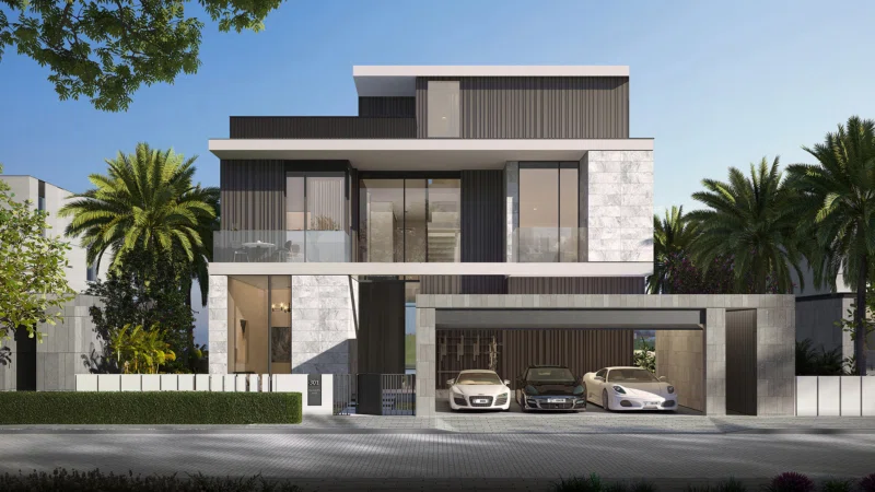 All villas come with finishes in shades of gray and white. Lots feature straight roofs, large windows, and balconies with glass railings.