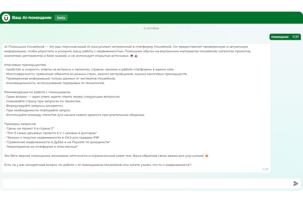 - Legal advice: “What are the laws on buying real estate in the UAE for Russian citizens?” → The assistant will show you up-to-date information on legal aspects.